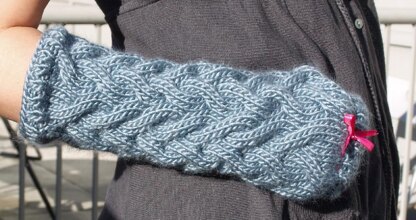 These fun and quick cabled fingerless armwarmers fit all sizes by changing the circumference during finishing with the ribbon to cinch them in as necessary. The cable pattern is simple enough for those who've never cabled before and provides a soothing rhythm to this simple knit.