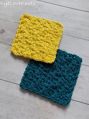 How to crochet an easy coaster built in half double crochet corner to corner boxes. You can also use this little square as a mini washcloth, or large facial scrubbie. You'll need about 22 Yards of Worsted Weight Cotton Yarn - I used WeCrochet Dishie in Bumblebee and Kenai. You'll also need an H8/5mm crochet hook, and tapestry needle. Gauge is not essential, and a hot cup of coffee is not hot enough to melt synthetic fibers so you can easily use any worsted weight yarn from your stash. For reference, I had mine ready in about half an hour.