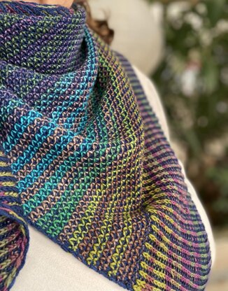 Collecting marbles is a two colour brioche, slightly assymetric triangle and reversible shawl in fingering weight yarn. Worked in different two-colour-brioche knitting patterns, it uses one skein of self striping yarn and one skein in a solid colourway to achieve an overall stunning pattern.