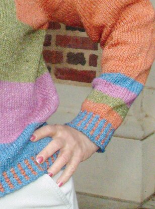 This is a great sweater to knit up if you’re interested in learning intarsia, yet it’s an equally satisfying project for the veteran intarsia knitter. The two-color collar, cuffs and hem add a lovely accent, and the different color sleeves balance the sweater beautifully.
