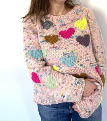 This pullover is knit with a chunky weight yarn and a US #11 needle. It is knit flat. Not in the round. This pattern comes with a chart for the hearts and has them all placed as shown. You can knit all of the hearts in one solid color or in as many different colors as you would like. The back can be knit solid as well as the sleeves or you can place some hearts on their too!
