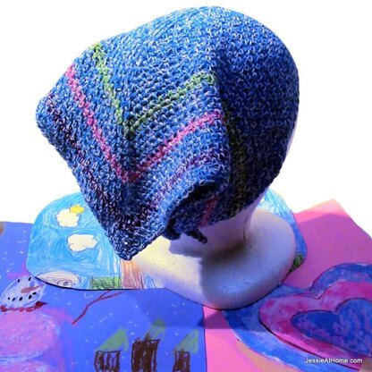 The Color Me Happy Kerchief is a great way to keep your hair back in a stylish and happy way. It also makes a great neck scarf, or make it much larger and create a stylish shawl. It is named Color Me Happy because the way the Baker’s Cotton yarn works up in the linen stitch, it reminds me of the drawings my daughters make for me.