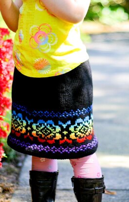 The skirt is knit entirely in the round from top down. It begins with a provisional cast on, which is used to allow for a knitted on waistband. There are two distinct sections in the skirt construction: A-line top portion and the straight bottom part that features a colorwork design. Since children significantly vary in height, the skirt length is easily customizable.