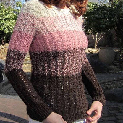 Color Twirl Pullover is a color-block sweater knitted with multiple strands of different color yarn. Larger knitting needles create an airy fabric with soft hand. Can be knit in any sport weight yarn. Choosing contrasting colors will create more dramatic pop-up transitions, whereas colors of the multiple hues of the same palette would produce more sophisticated blended effect.
