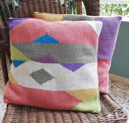 Cushion 2 features color blocks using the intarsia method. The blocks are knitted in stockinette stitch.