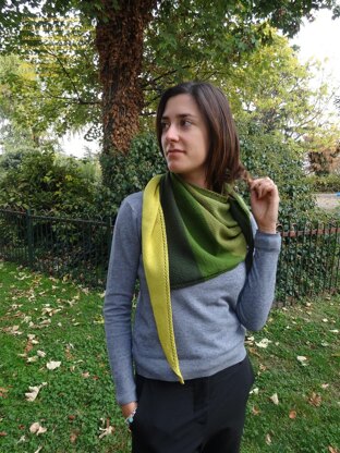 Shawl with a very wrapping shape: a triangle stretched horizontally. You can work at will this pattern (for you, for a gift ...) worked with a wool rich in shades in various colors. Simple processing but with accurate details, both in the increases and in the blocking.