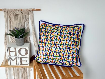 The cushions are made from 2 identical sides, back and front. After finishing the cushion squares using the main color, a sl st embroidery is made on the front side using the contrasting color.