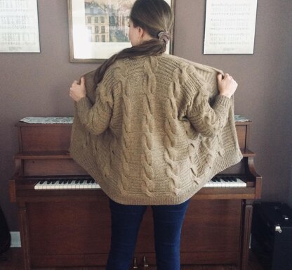 This cardigan is knitted flat, bottom up, from the back to the shoulders, where it is separated into two Fronts. The Fronts and knit separately, top-down. After seaming the side seams, sleeves are picked up and knit down, in the round. Finally, an Applied I-cord is added to finish the front edges.