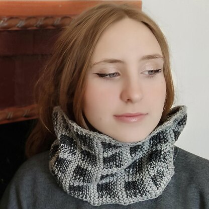 A fun cowl with a marlisle colorwork that creates the illusion of three dimensional holes in the surface, reminding a famous building in Rome (Colosseo quadrato). The effect is obtained working the lighter parts with one color, the darker parts with the other and the intermediate parts with both colors held together