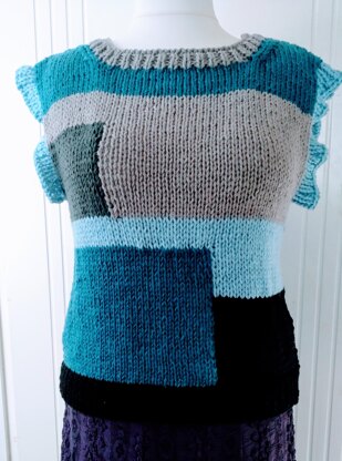 An on-trend colour block, or perhaps a throwback to the 80's, this is a warm but lightweight top which can be worn on it's own or to add layers. It is knitted using 2 strands of yarn held together which creates a fabric similar to a soft super chunky texture. It is suitable for advanced beginners or intermediate knitters as there are two colours being used at the same time in most of the garment. It is very quick to knit, the only challenge may be in choosing your colour combinations !