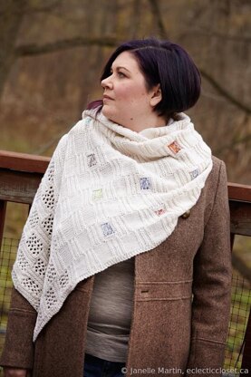 The Colour Box Shawl was inspired by the shadows of colour seen in glaciers and reflected in snow. The shawl has a deep border of lace and then transitions into the box motif. The shawl is knit using 4 strands of laceweight throughout and the coloured squares are knit holding an additional strand of laceweight (5 strands).
