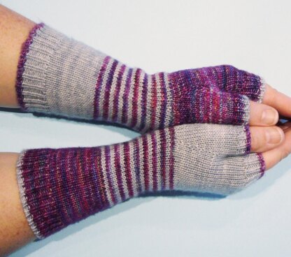 These mitts require just 25g of each colour of sock weight yarn. I made mine in Malabrigo Mechita Pale Morn and Aniversario, but you can use any standard sock yarn!