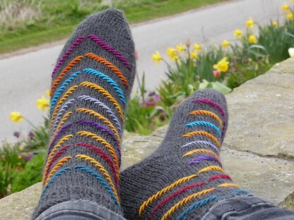 If, like me, you cannot bring yourself to throw out those last few yards of leftover sock yarn but then don’t know what to do with it then these socks could be just what you are looking for. Colour them crazy or use the same colour for all the chevrons. It is entirely up to you and what scraps you have.