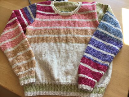 Soft stripes on a cool cream background make this jumper an absolute must-knit this summer.