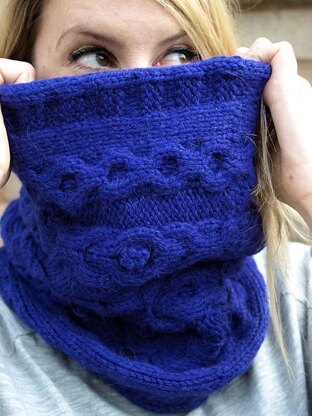 Inspired by bright pops of colour amid the grey of city streets, this chunky cabled snood is knit flat on a fairly tight tension for structure, then grafted together.