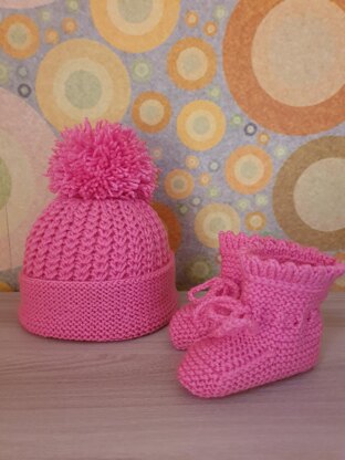 The hat can be made flat and later sewn at the back or worked in the round. Both instructions are provided in the pattern. Booties are made flat on 2 needles and later sewn together at the back.