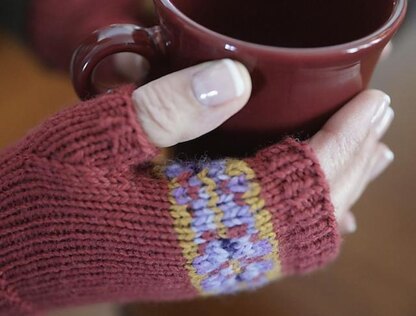 Knit mostly in plain stockinette with a colourful fair isle design around the palm of the hand these fingerless mittens are perfect for days where you need to ward off the chill even in the house, want a second layer on your hands under your regular mittens, or if it’s just warm enough for bare fingers but not bare hands.