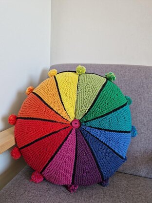The front segments are knitted in twelve colours to show the primary, secondary and tertiary colours in the colour wheel, each segment separated by two rows of stocking stitch in black.