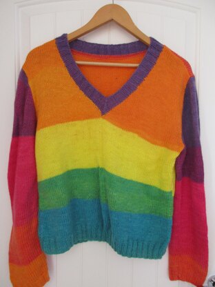 This is a pattern for Colourwheel Jumper, originally published in Simply Knitting. It takes it s name from the Sirdar Colourwheel yarn. This is a long space dyed yarn on 150 gm cakes, which forms large areas of colour.