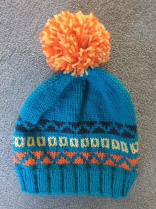 This brightly coloured hat made with pure peruvian wool is knitted using the stranded knitting method on circular needles. The rib is knitted in 3 x 2 and the main body is in continuos knit and uses a pattern chart so that you can follow the colour changes. The finished hat has a circumference of 16” and will stretch comfortably to 23”. The hat is finished with a bobble using 2 of the colours mixed together