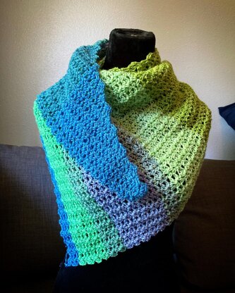 Come back to me is a lacy textured triangle crocheted wrap designed with cake yarns that had been sitting in my stash for far too long. Instructions are provided for two different shapes - a more traditional triangle with a curved top edge, or an elongated asymmetrical triangle, perfect for wearing around a neck. Any yarn can be used - choose a thicker yarn if you want a warm, snuggly wrap, or a lightweight yarn if you want a delicate lacy piece! You can make the wrap as large as you want by working more rows, and you can use all one color or multiple colors if you want to control the stripe width. The pretty scalloped borders develop as the shawl is crocheted rather than being added at the end, so you can stop any time.