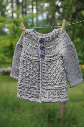 Coming Home Cardigan is knit seamlessly from the top down. The delightful blend of stitch motifs used are fun and easy to knit. The sweater is conveniently written in 10 sizes ranging from newborn to 10yo. All measurements are given in US and metric.