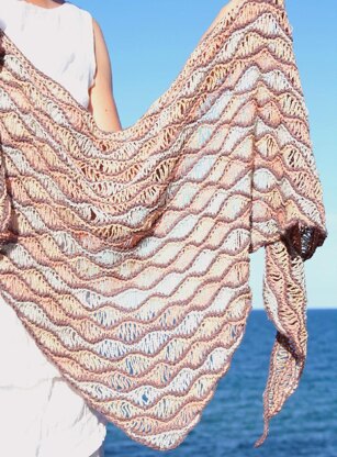 Are you ready for the summer, the sea, and a sunny beach? This shawl truly fits into that mood with its light silk fibres and the drop-stitch pattern, the airy sea foam lace, which is reminiscent of the wash of the waves and sea shells.