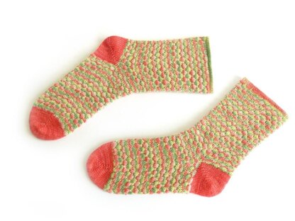 The stitch pattern used in this sock plays around with the depth of knitted lines, so breaking up the variegated colours of the sock whilst also giving a slight texture to the socks.