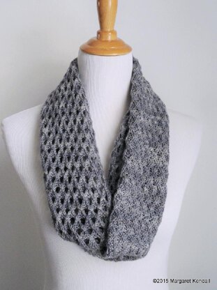 Wear Conflation wrapped twice as an infinity scarf or three times as a cowl. The combination of texture and shadow works especially well with hand-dyed or kettle-dyed yarns. Conflation’s trellis pattern appears as an overlay on a base divided between large open eyelets and reverse stockinette st and is bordered with a 2-st garter st edge.