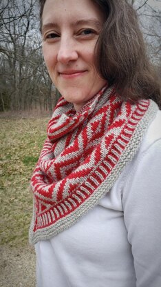 Congruence begins like a top down shawl, and then is joined to work in the round. It has stripes and garter ridges at the neck, moves into a pretty colorwork section of interlocking and mirrored triangles, and finishes with a garter band.