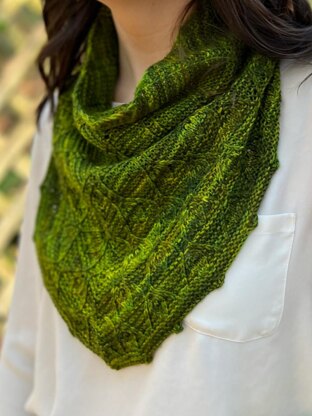 The Conlyn Cowlette is a cozy accessory that is worked both flat and in the round. You start with a flat triangle and join in the round to finish the cowlette. The leaf lace pattern on the garter stitch background makes the most of the rich green from Copper Corgi.