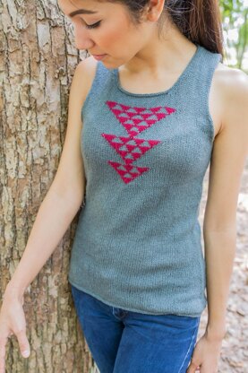 Connected is a bottom-up, seamed sleeveless top, featuring a colorwork motif on the front and back of the garment. The two pieces are worked separately, seamed together, then a I-Cord BO hem is worked around.