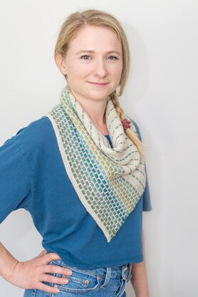 Notes: Asymmetrical cowl, knit sideways and shaped using increases. Slip stitches are used to add dimension to the changing colorways of the accent color. Must be seamed.