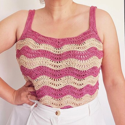 Construction: Worked seamlessly in one piece, starting flat for the neckline shaping, then joined in the round. Straps are added at the end, worked onto the finished tee.