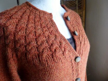 Copperline, at first glance, is a classic cabled yoke cardigan, worked from the top down with gradually increasing cables. The cable detailing is carried through the pattern, along the front, and down either side of the raglan lines & the side "seams". Subtle shaping is incorporated into the piece. Copperline extends below the hip, creating a flattering line that will become a great go-to sweater for chilly days & evenings. Many thanks to Helena and Rochestitcher for testing & for your excellent suggestions!