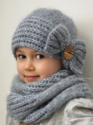 A refined, lady-like cloche hat paired with a looped scarf, featuring alternating bands of brioche and stockinette. The irresistible faux bow with decorative button on the brim enhances the vintage style. The hat is easily convertible to a snuggly headband or a snazzy neck warmer - simply cast off after the brim and voila!