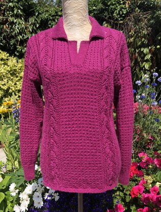 A beautifully feminine sweater with a neat shirt-style collar. The main stitch is a semi rib textured stitch with a pretty panel of easy eyelets running up to the shoulders. Cuffs, collar and neck borders are in single rib. Worked in a luxurious super soft yarn making this extra special to wear. Worked bottom up and with full written instructions.