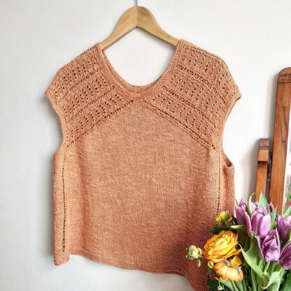 This deceptively simple top is an easy-to-wear, contemporary design that showcases a lattice and fan-lace shoulder. The exaggerated raglan decreases form a butterfly-like line that gives this must-have top an added dose of elegance.