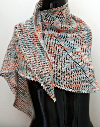 I knit this long-tailed triangular-shaped wrap with Qing Silky Merino Single in the Hurricane colorway and loved working with this yarn. It's smooth and shiny and the stitch patterns are well-defined even with the variegated color patterns. It blocks beautifully as well.