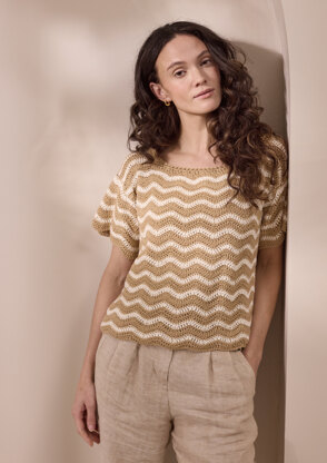 Breezy, playful, and effortlessly chic, this crochet summer tee is perfect for warm-weather style. A striking chevron stripe pattern in two contrasting colours adds a modern twist to a classic summer silhouette. Knitted using soft and luxurious Cotton Cashmere.