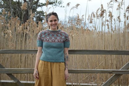 Corelle is a seamless sweater, knit from the top-down, inspired by Corelle China patterns and vintage knit sweaters. The yoke features a variety of sweet color work patterns separated by rings of solid and alternating color bands. The neckline is worked as a rolled knit edge and the sleeves and body end in ribbing. The slightly cropped body makes this design great for layering over dresses or pairing with high-waisted pants. Included in the pattern are options for short and long sleeves. Included in the pattern are instructions for short and long sleeve versions. Knit up in Nash Island Tide yarn, a rustic hand dyed yarn available in a variety of colors.