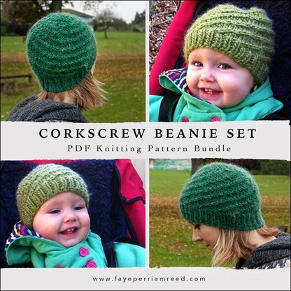 Both the child and adult versions of Elana’s Corkscrew Beanie, sized from preemie to large adult. Both patterns are written so you can work either flat on two needles or in the round on DPNs or circular needles.