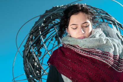 This asymmetrical triangular shawl begins with only a few stitches at one point and increases outward from there. A pretty undulating lace pattern is bordered by a bold band of garter stitch and eyelets. This shawl is designed for two colors, but will work just as well knit in a single color.