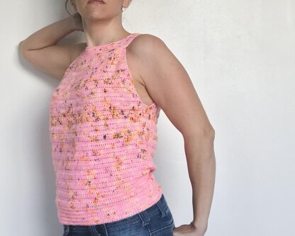 Corona is a loose fitting sleeveless yoke based vest . Worked from the top down this is a fun, practical crochet summer top. With a keyhole split down the back between the shoulders and a loose airy drape at the front, this top will keep you looking and feeling cool all summer.