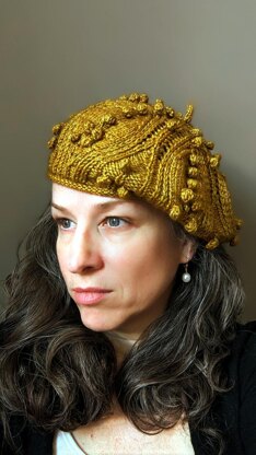 Knit in the round from the brim to the peak. A repeated motif is knit multiple times, building volume in the beret, and the motif tapers flat at the top, with a traditional i-cord to finish