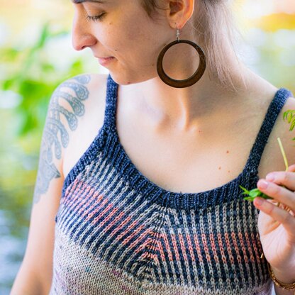 Cosmic Ray is a cute tank top that will grow on your needles at nearly the speed of light! It’s an easy, colorful and fun project for knitters of all skill levels. It is worked from the top-down to easily make a crop length top as pictured, or a longer garment. The vertical stripes are made using slip stitches, requiring to knit with only one color of yarn on each row. The front and back are identical, and the subtle sweetheart neckline and armholes shaping are made almost without noticing, by following the simple chart. This quick project is made by using DK weight yarn in 2 to 4 colors, using new skeins or leftovers, making it a great stashbuster. This pattern is size inclusive and is available in 8 sizes from 33” to 61” at bust, and should be worn with little to no ease.