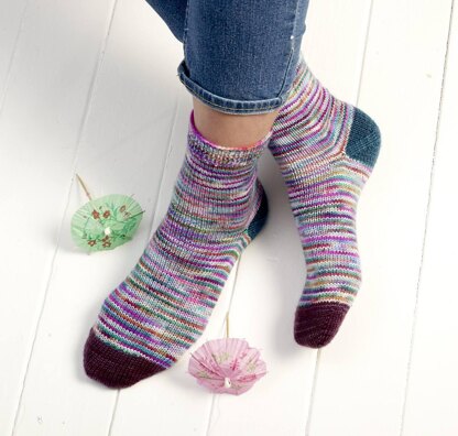 These pretty helical socks are a great way of using leftover sock yarn in a mix of colours. Recommended yarn is Manos del Uruguay Alegria which comes in a range of beautiful hand-dyed colours and is dyed by highly skilled artisans in Uruguay using traditional methods handed down through generations.