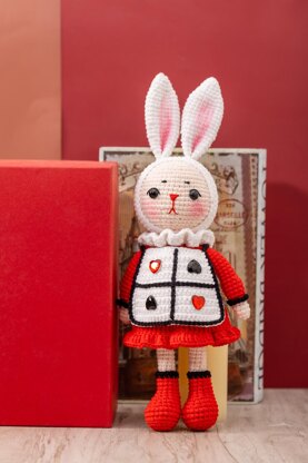 Materials Needed: Yarn A (1 ball/100 grams) --- 5-ply milk cotton, white #01 Yarn B (1 ball/100 grams) --- 5-ply, milk cotton red #15 Yarn C (33 grams) --- 5-ply milk cotton, beige #41 Yarn D (10 grams) --- 4-ply milk cotton, black #21 Toy stuffing (50 grams) Scissors Yarn needle Stitch marker Alcohol glue 2.5mm crochet hook Four 10mm flat black eyes Eight 14mm heart pieces. Eight 14mm spade pieces