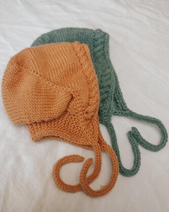 This cosy bonnet uses DK yarn. It is worked mostly in stockinette with an i-cord edge and ties and has a basic cable front. It has a snug fit but is quite stretchy. This bonnet knits up quickly, making it great for a last minute homemade present.