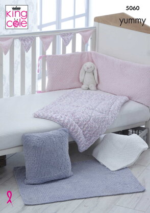 Cot Bumber, Cot Cover, Blanket/Rug, Cushion & Bunting in Cole Yummy - 5060 - Downloadable PDF is a Intermediate Knitting pattern by King Cole, available as a Downloadable PDF and includes instructions in English. Super fun to make, this pattern could be your next masterpiece!